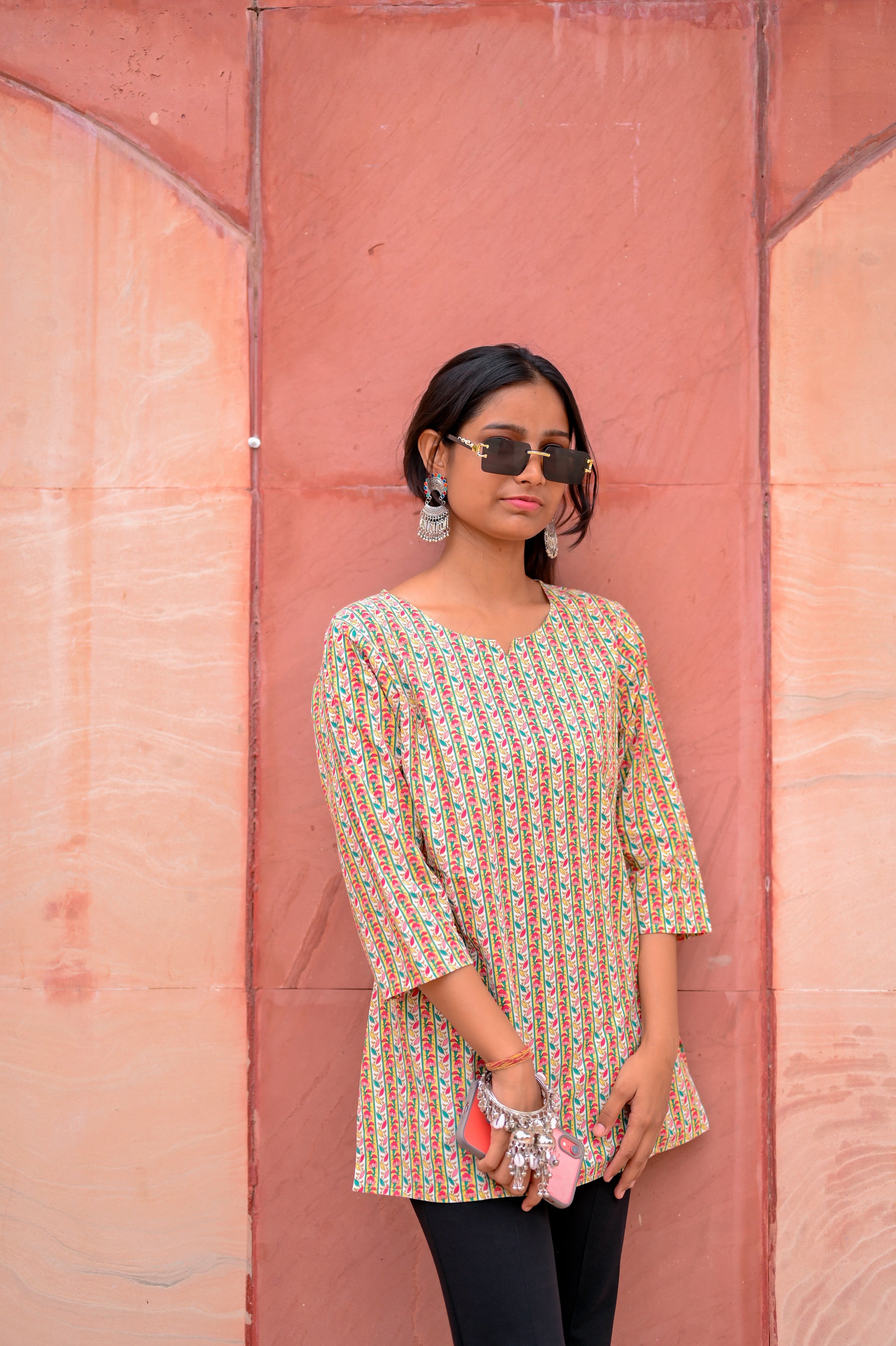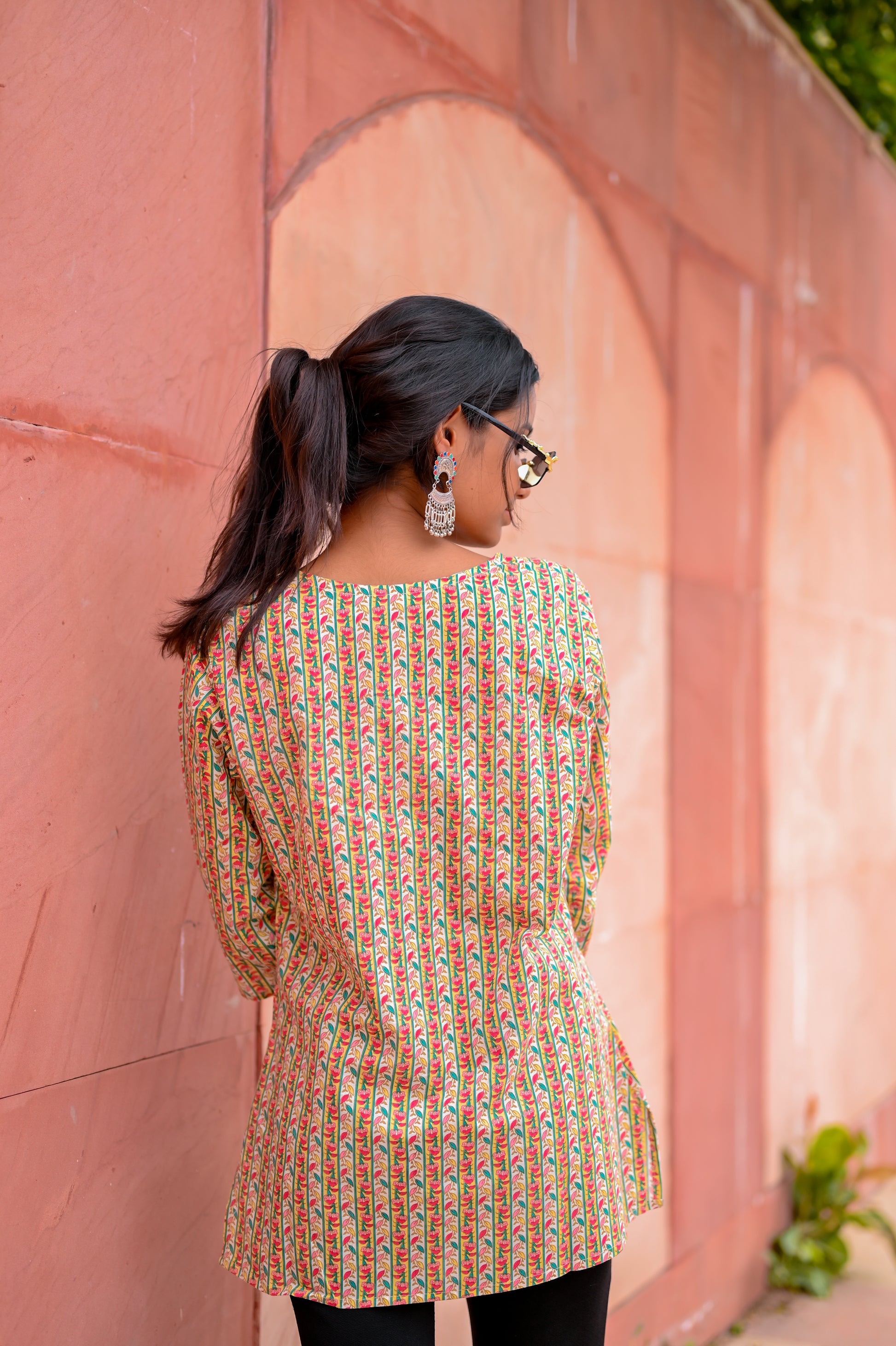 Printed with delicate floral vines in vibrant hues, this piece blends traditional Rajasthani charm with a hint of modern boldness. The soft, breathable fabric ensures comfort, while the half-sleeves and classic neckline make it perfect for festive brunches or casual desi outings.