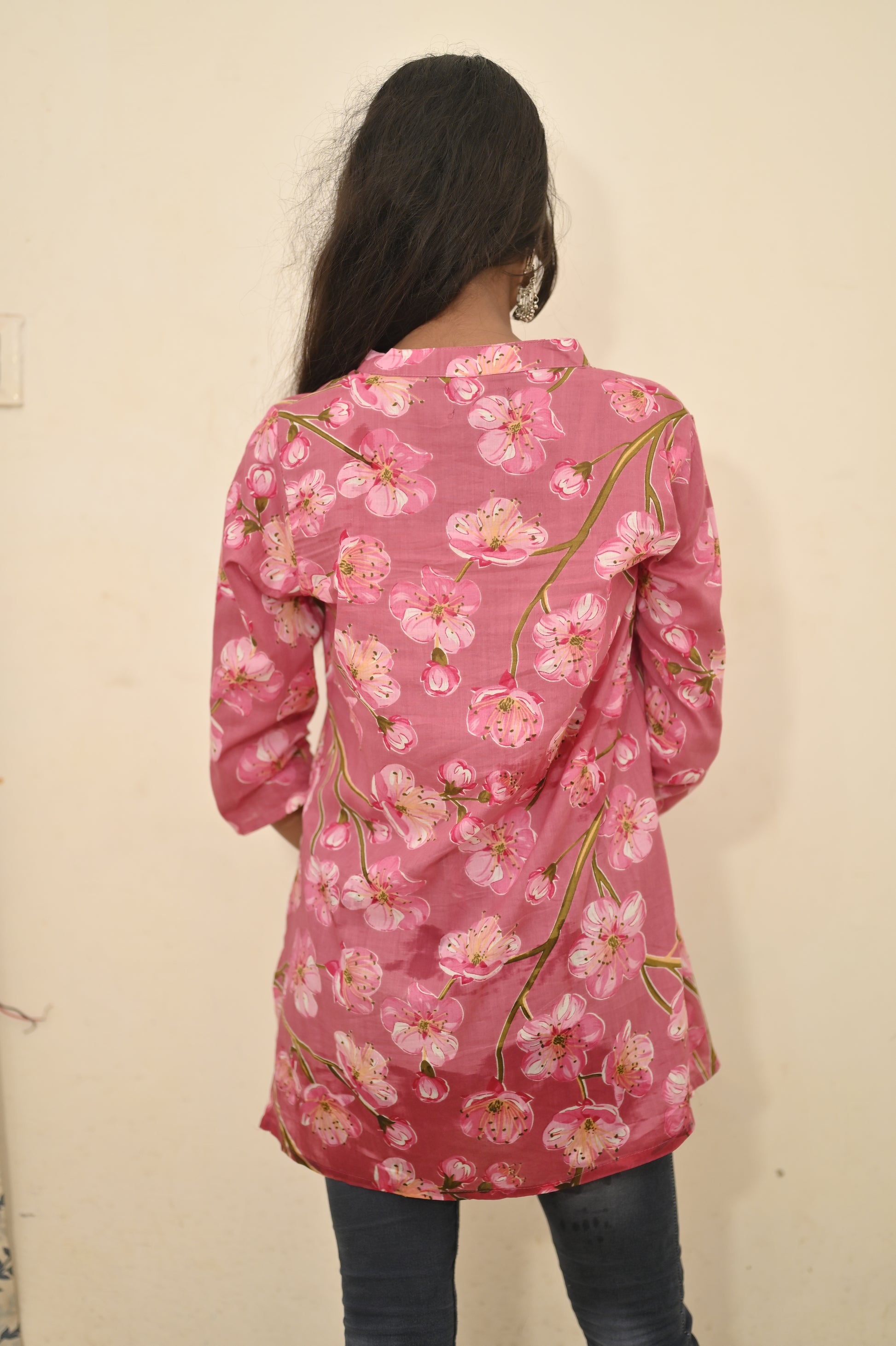 This short kurti features a delicate white floral print set against a vibrant pink background, creating a fresh and elegant look. Designed with comfortable 3/4 sleeves, it offers both style and ease of movement. Perfect for casual or semi-formal occasions, this kurti combines traditional charm with modern appeal.